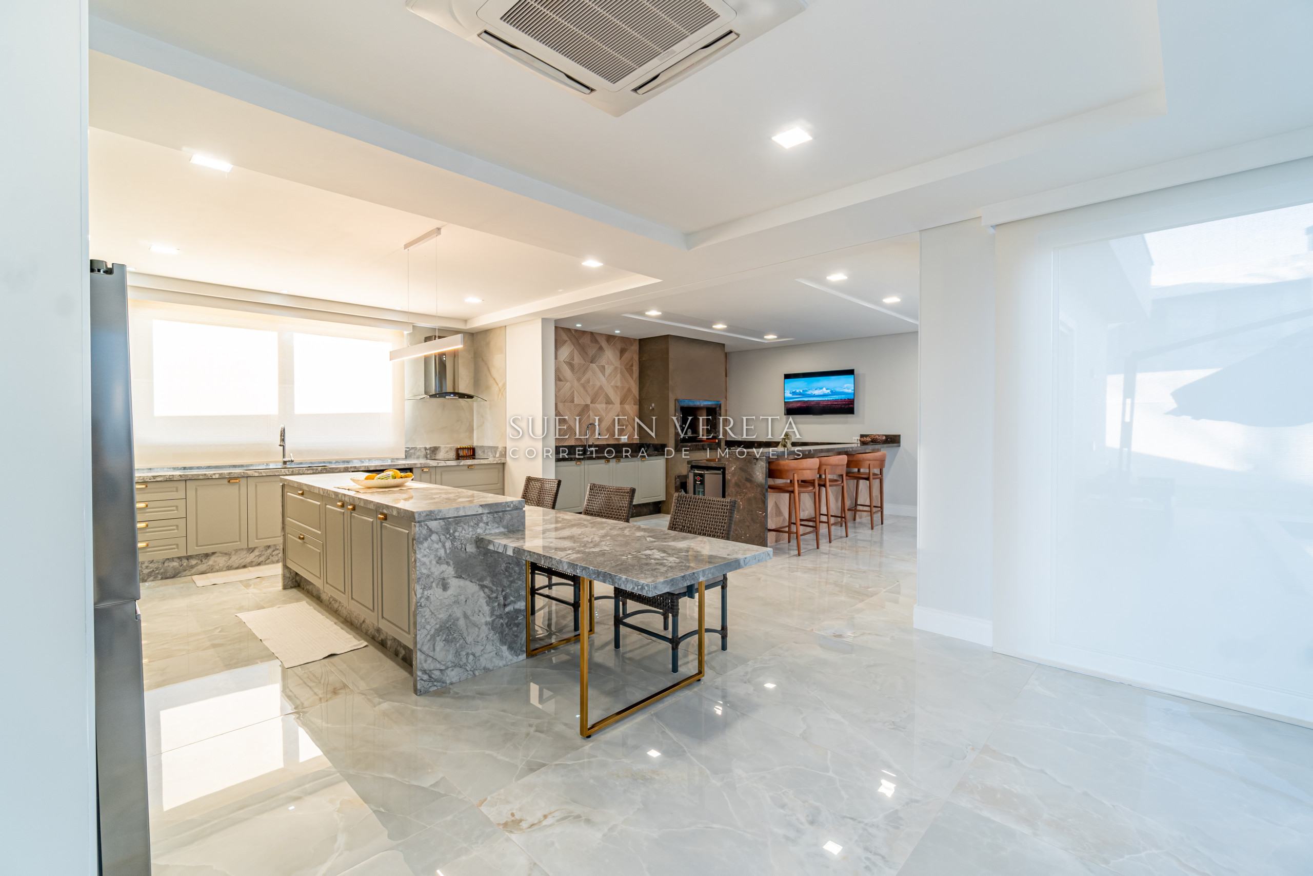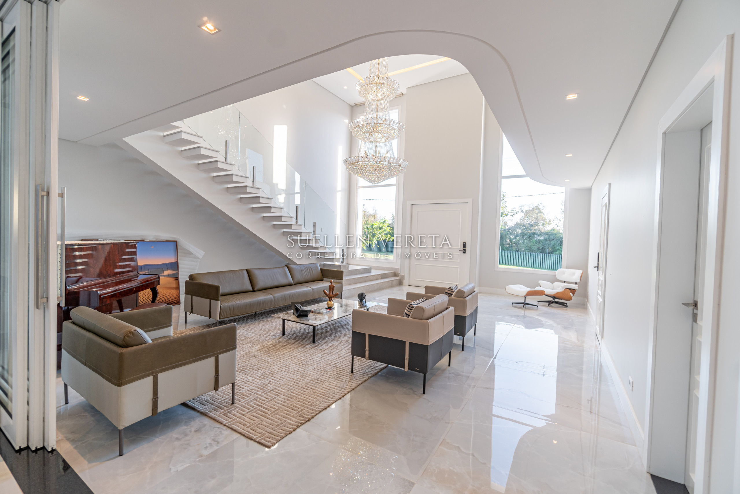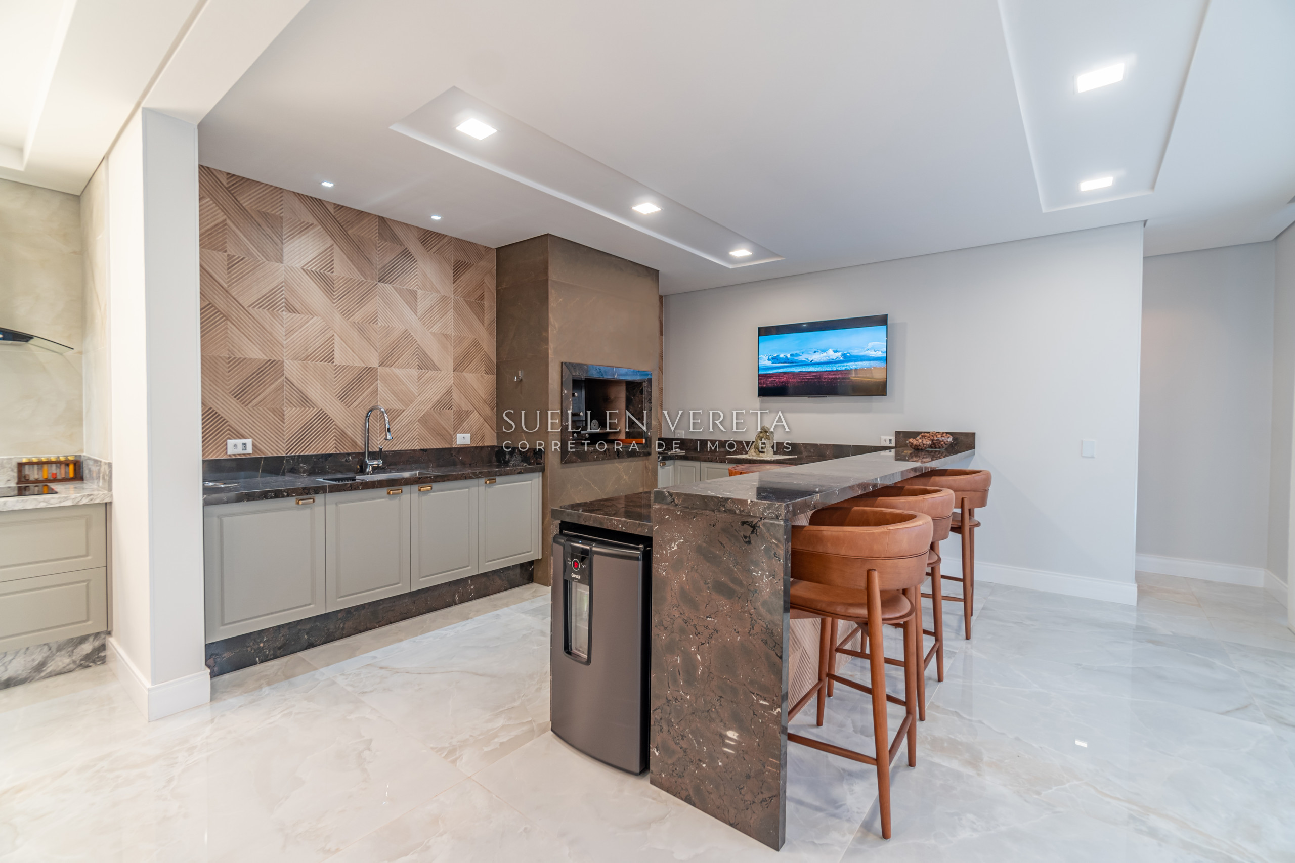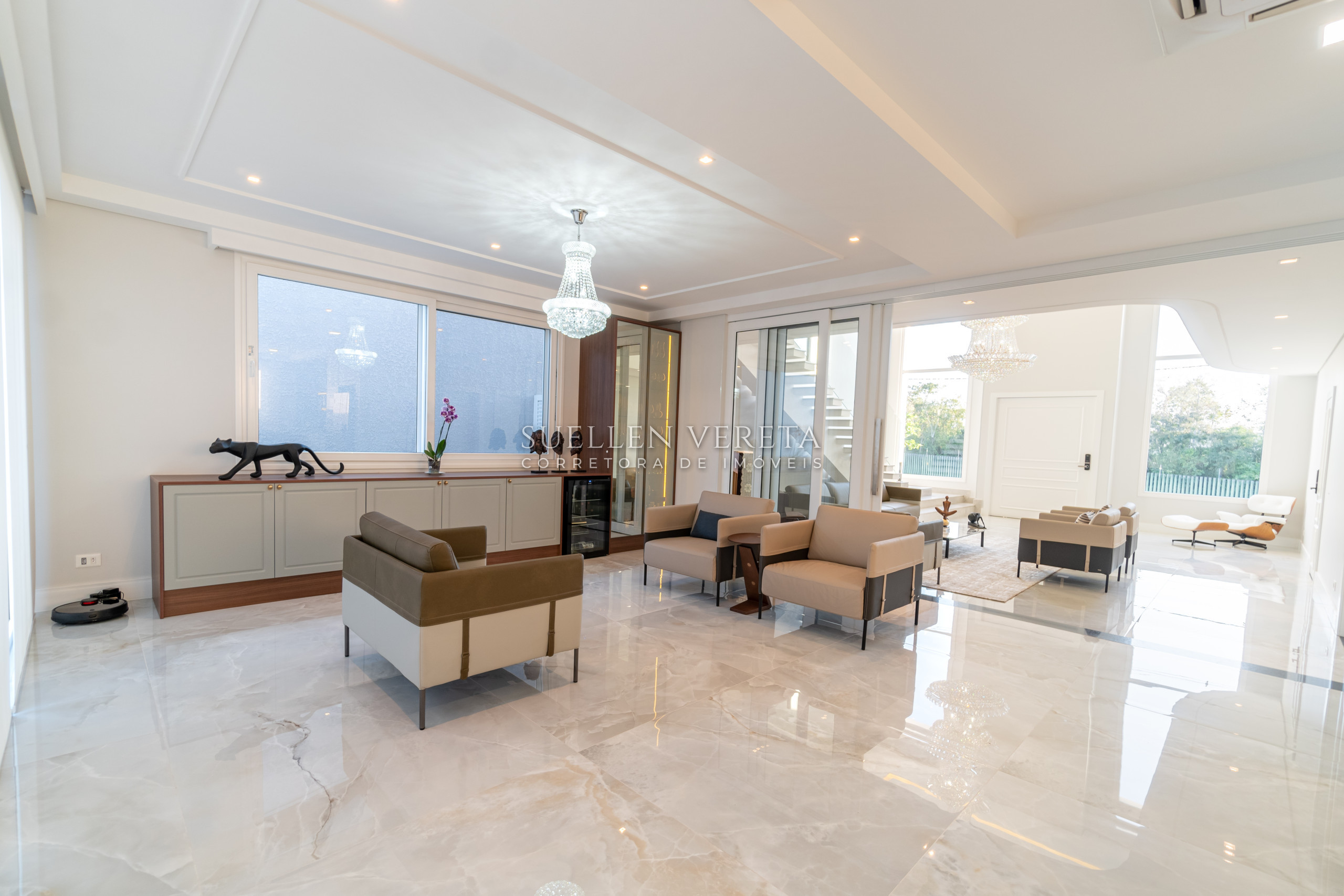 Na entrada um suntuoso lustre destaca o living com pé direito alto e amplas janelas trazendo muita iluminação natural ao ambiente, além do lavabo, uma suíte, espaçosa área gourmet e churrasqueira integrada à área externa com uma convidativa piscina aquecida com hidromassagem. Área de serviço e banheiro social finalizam o ambiente térreo.
